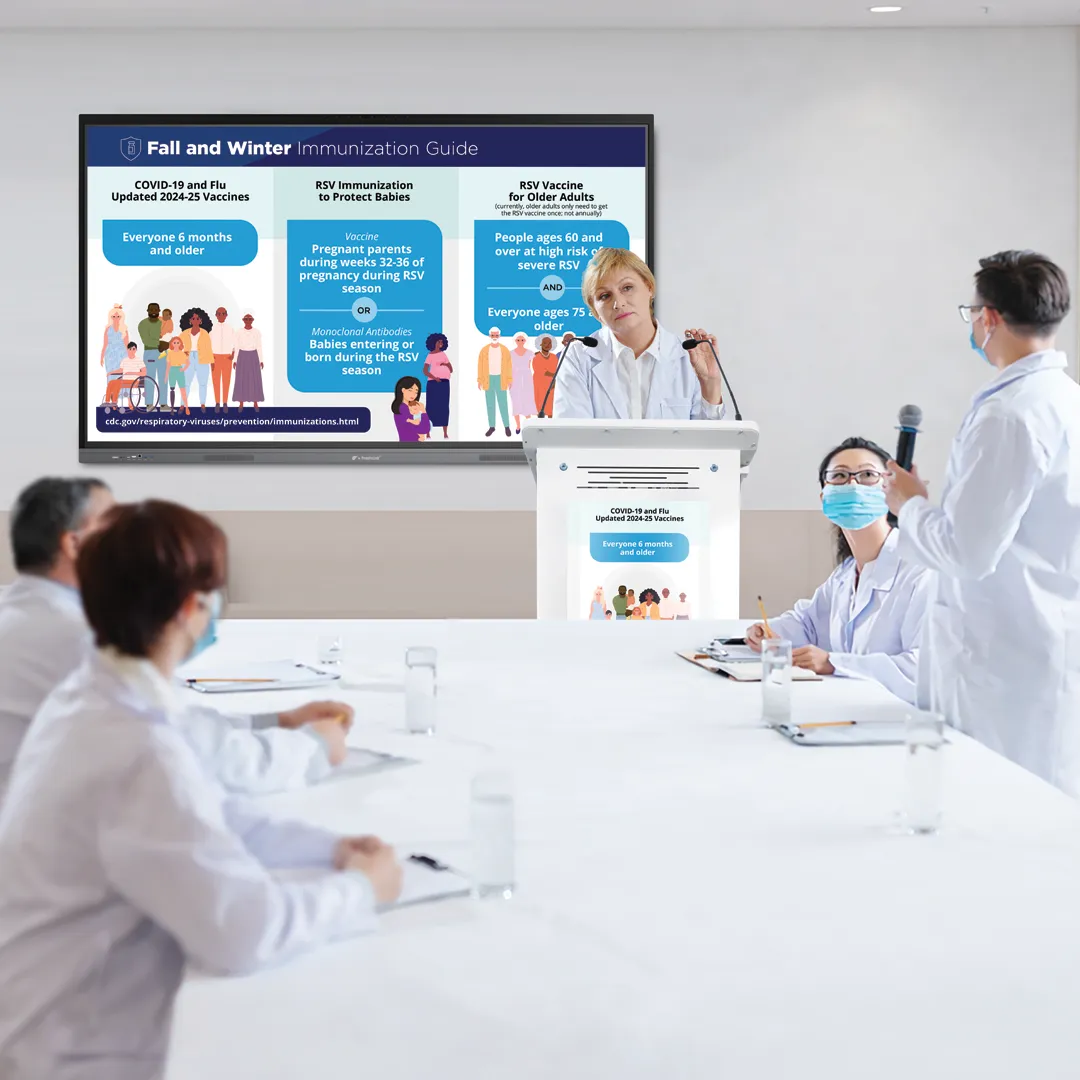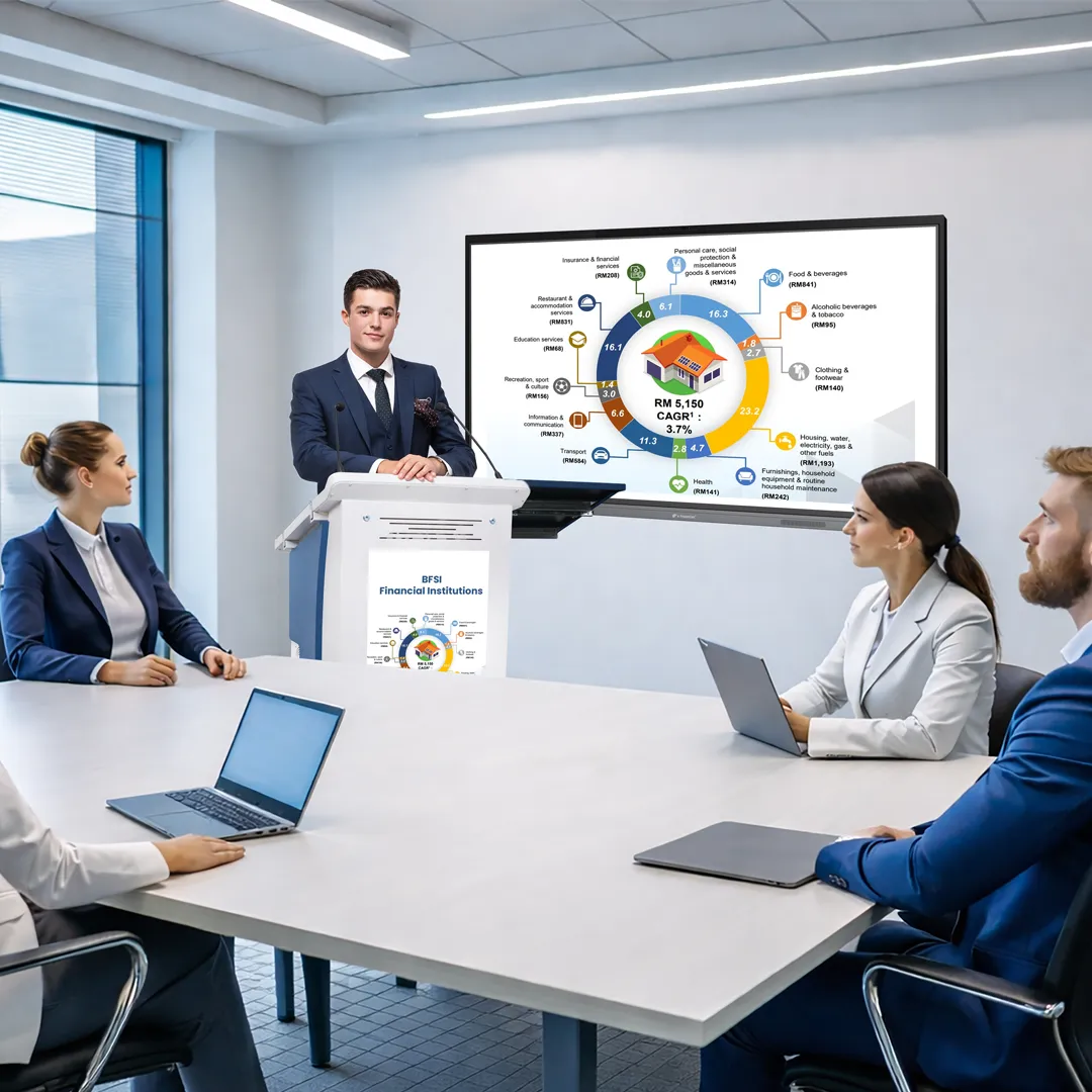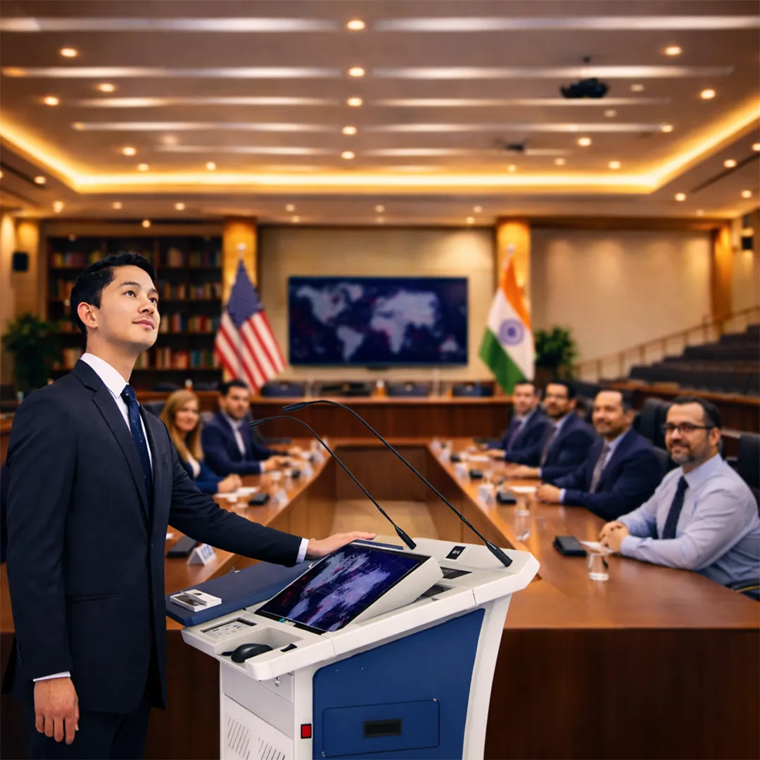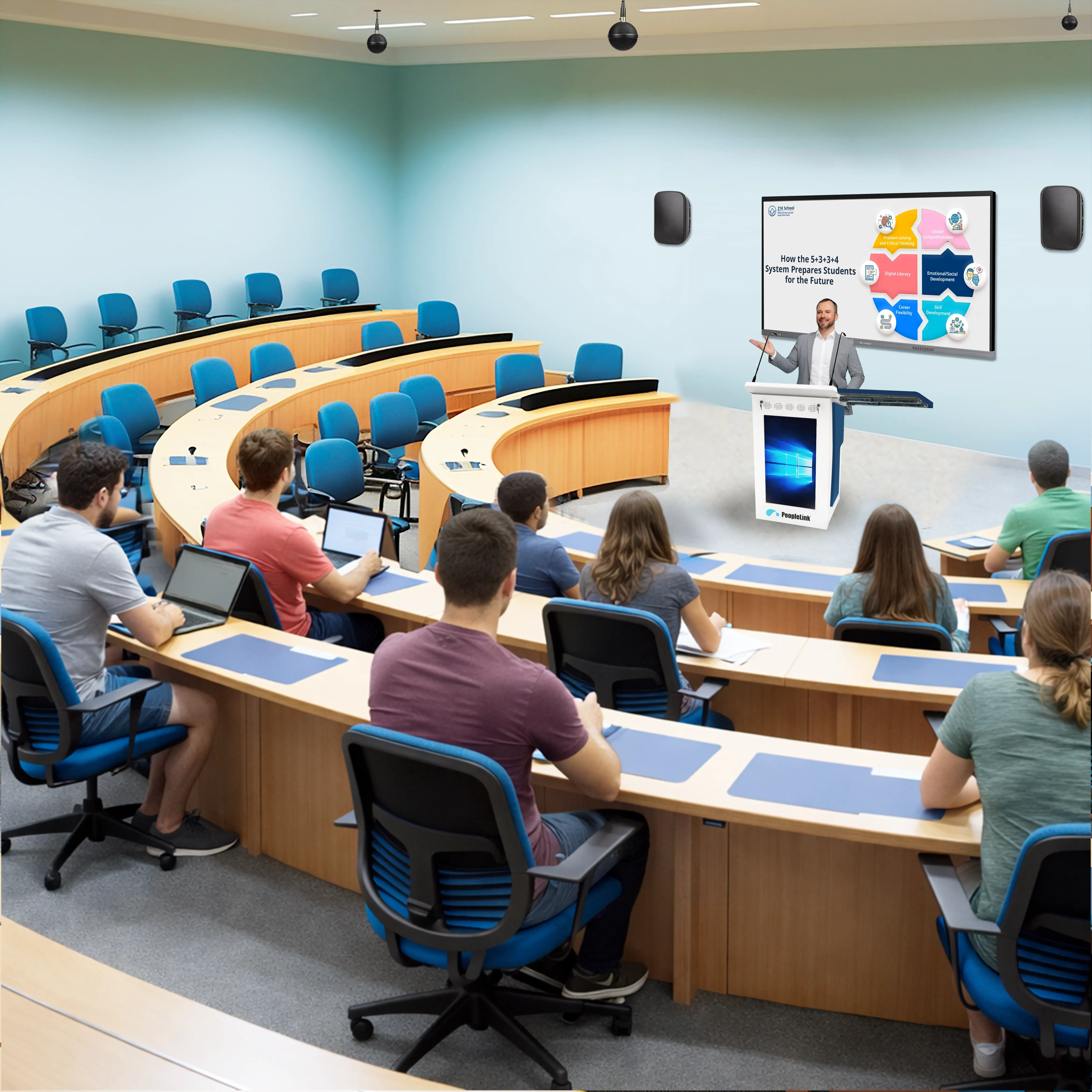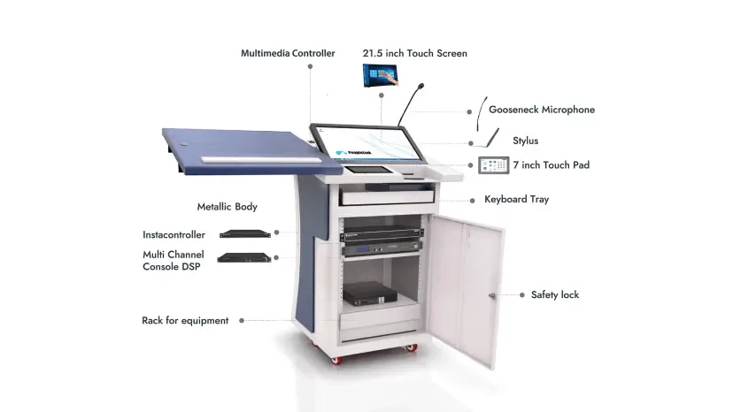 Smart digital ePodium that lets you manage presentations, audio, and displays from one control point, with built-in screens and adjustable height for presenter comfort.
